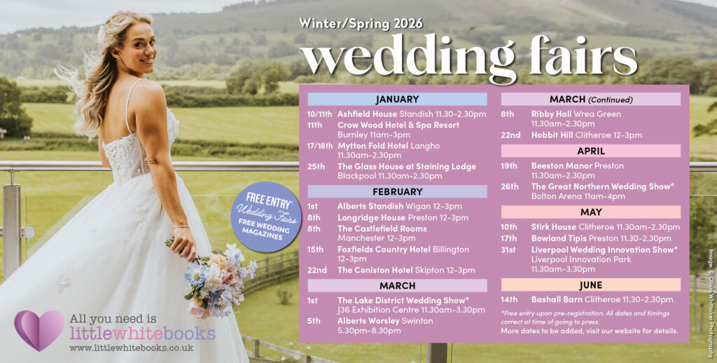 Little White Books’ Wedding Fairs take place at award-winning wedding venues across the North West region; covering Lancashire, Manchester, Merseyside and Yorkshire. Our flagship event is the incredible twice yearly Great Northern Wedding Show at Bolton Arena, which is the North West’s biggest one day wedding exhibition.