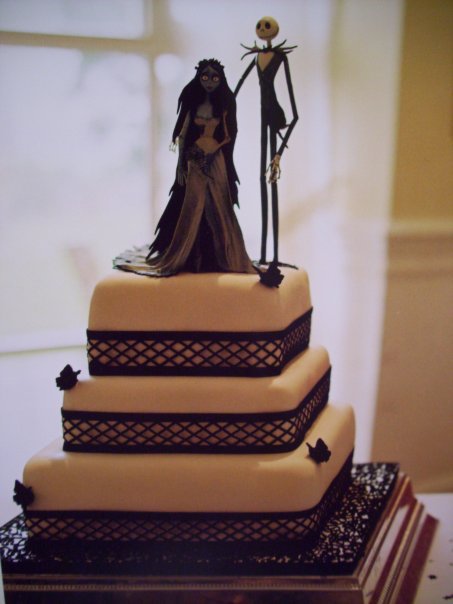 The wedding cake was a three tiered square cake; bottom and top tier were both chocolate, and the middle tier was lemon drizzle. (I hate fruit cake, will make it for others though, just don’t like it myself). All three tiers were covered in white fondant, and trimmed with black trellis ribbon. Our cake toppers were based on Tim Burton’s ‘’Corpse Bride & Nightmare before Christmas’’, and were an absolute hit with everyone who knew the movies. It also had little black bats or butterflies scattered here and there, basically that was our colour scheme (black and white). The lady who made it is Di Sault, she’s an old friend of mine, we used to work together, she lives locally too, though her cake decorating is a hobby, not a job, so she made the cake for us as our present.