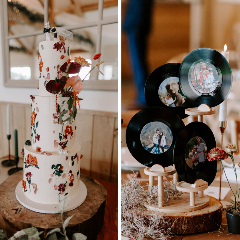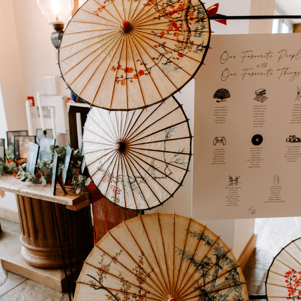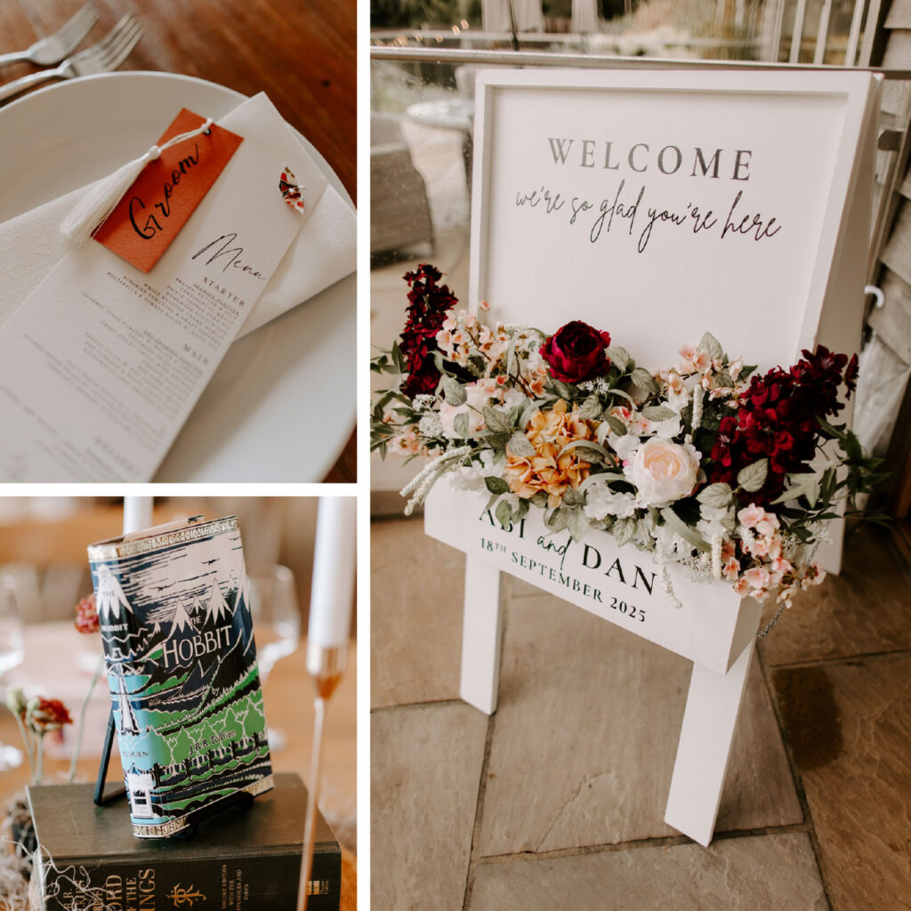 A lot of our styling was DIY. My parents handmade the welcome sign and my mum designed the floral box attached it. The seating chart, welcome table, cake table and memory table were all DIY as well. For our table centres we used things we already had around the house or I made myself, that represented things we both enjoyed (i.e reading – we used The Lord of the Rings and The Hobbit Books; Asia – we used fans and Kokeshi dolls we got from travels; skiing – we used a Christmas decoration of a ski hut; gaming – we used a N64 controller and some games; hiking – we used Duplo hiking figures and a Warhammer mountain scene; Anime – we used studio Ghibli ornaments; F1 – we used the outline of Silverstone and two toy McLaren cars; and music – we used vinyl singles and covered the centre with photos of us).