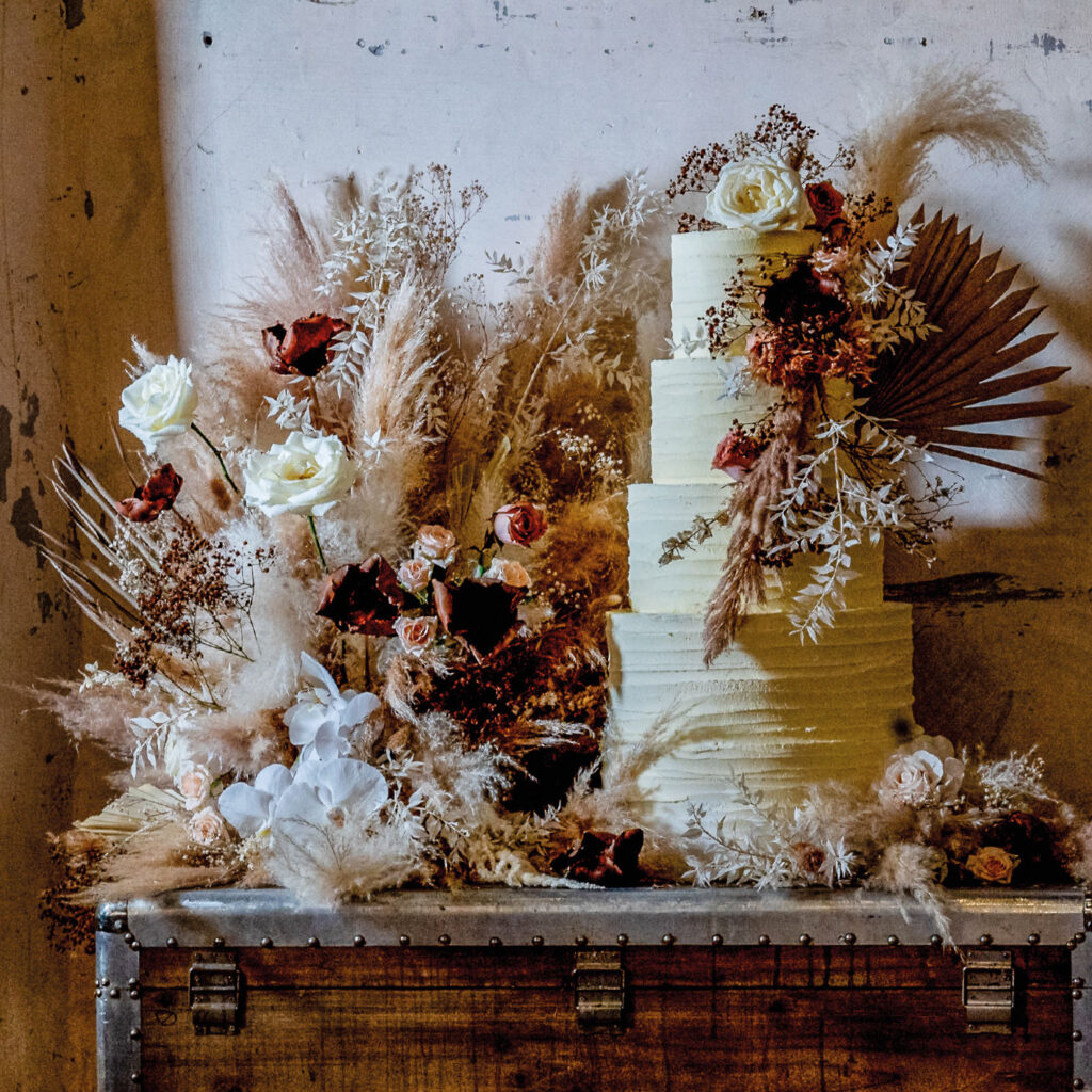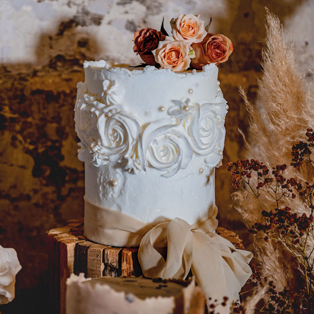 Huge thanks to our host venue Holmes Mill, winner of the 2024 Great Northern Wedding Awards ‘Best Creative Space Wedding Venue’. Holmes Mill is an early 19th century Cotton Mill that has been painstakingly and sympathetically transformed into the most incredible and wholly unique wedding venue in the North West. Our Great Cake-Scape shoot took place in The Cotton Room, a licensed ceremony and party room complete with natural textured walls, exposed beams